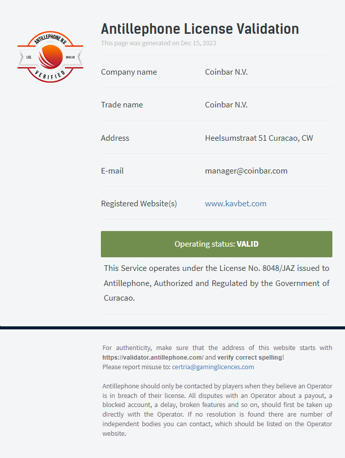 - Lisans Bilgileri: Kavbet, uluslararası geçerliliği olan bir lisansa sahiptir. Kullanıcılar, site üzerinde yer alan lisans numarası aracılığıyla bu bilgiyi doğrulayabilirler.