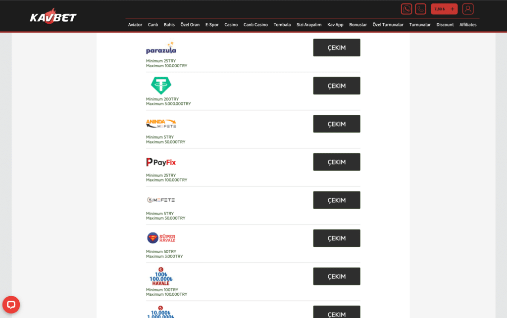 | Kavbet Para Çekme Yöntemleri | Minimum Tutar | Limit |